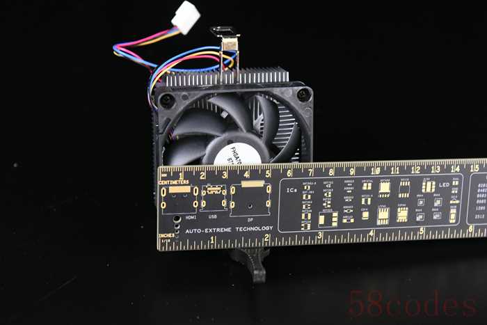 拆开包装你就能看到内部稍显简单的处理器本体、散热器跟简易使用说明。散热器的高度控制得很低,风扇同样很小巧,不考虑误差的话我们的测量结果是这风扇宽度就刚刚好7公分。这种规格的处理器搭配的散热器是不会有铜柱的,底部是已经涂好的硅脂覆盖散热底座而已。虽然看起来显得比较简陋,但实际上压制速龙200GE,它的效果还是蛮好的。