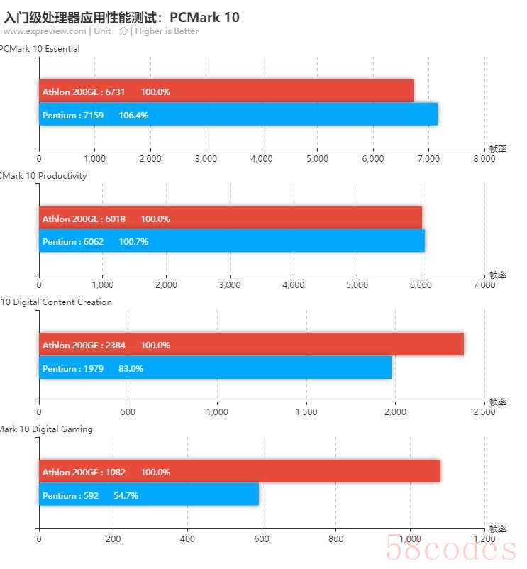 而其他的工作模拟表现,比如说网页浏览、写作等工作方面,基本的趋势依然是英特尔领先,网页浏览方面差距不大,都是3%以内,但是写作方面的跑分方面差距达到16%,不过这里其实大家看看就好,因为差距只有零点几秒,其实只有统计学上的意义,基本体验是很难感受出来的。而在更新的PCMark 10当中我们可以看到对于两款产品的最完整的展示,在基本体验方面差距是6.4%,生产力方面差距很小,数字内容创作方面速龙200GE领先17%,游戏方面近乎是翻倍的,后两者肯定是出于Vega 3核显的优势。