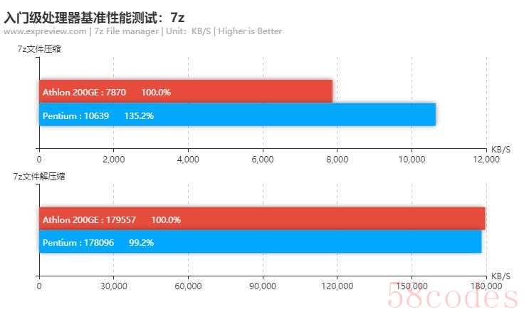 因为速龙200GE、奔腾G4560处理器两者本身的规格都是一致的双核四线程,而且后者拥有更高的频率、更好的内存延时表现,所以在考验处理器运算性能的常规测试项目当中,比较多的情况就是看到前者相比后者有差距,尤其是在考察单线程性能、内存延时性能的项目当中,这些一般来说是英特尔的常规优势项目,所以差距会稍大,而在考察多线程表现的项目当中两者的差距会被拉近。比如说7z,压缩测试的时候两者差距蛮大的,但是解压缩的时候能够小幅度反超,相类似的表现还能在同是八核十六线程的Ryzen 7 2700X、Core i7-9900K的比较中看到。