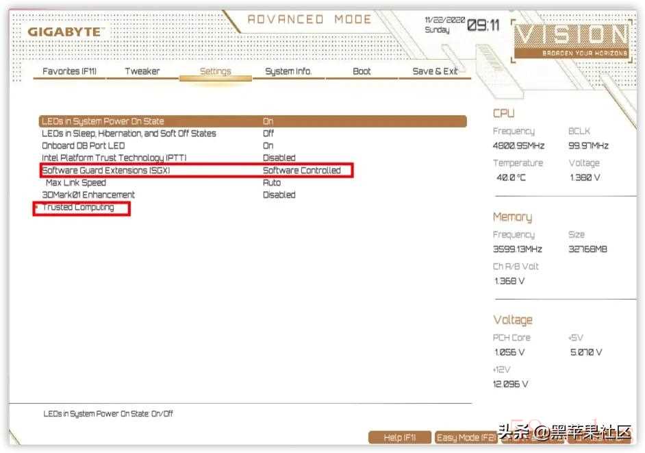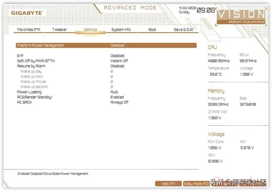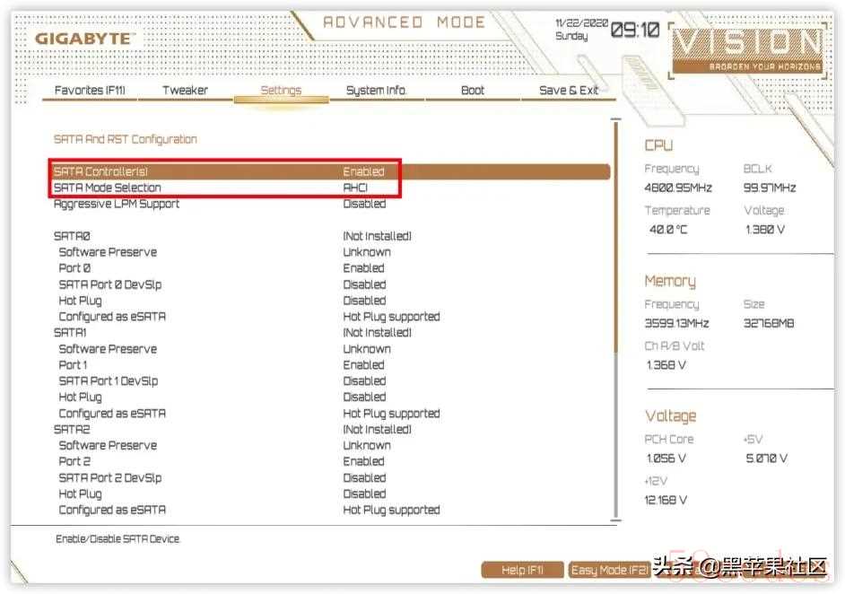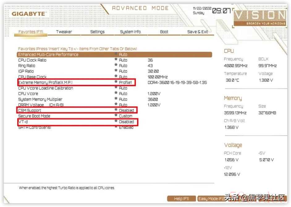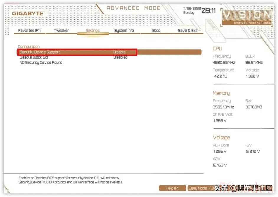 技嘉(GIGABYTE)Z490 Vison D 为例,同品牌其他型号大同小异:开机快速点按 Del 进入BIOS设置 F2进入高级模式