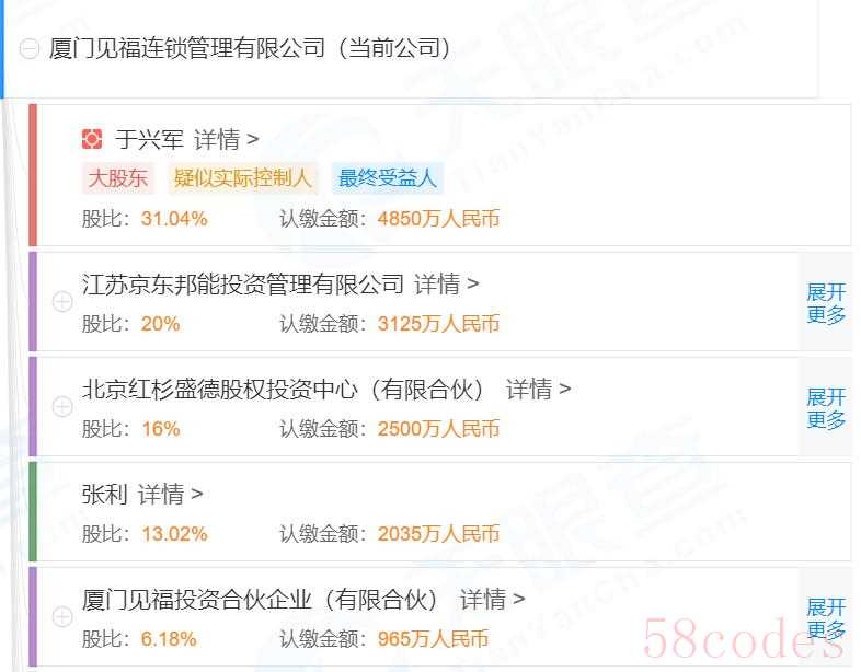 在可查询的公开工商信息中,“厦门见福连锁管理有限公司”的第一大股东叫于兴军,占比31.04%;第二大股东,便是京东,占比20%;第三大股东是红杉资本,占比16%。