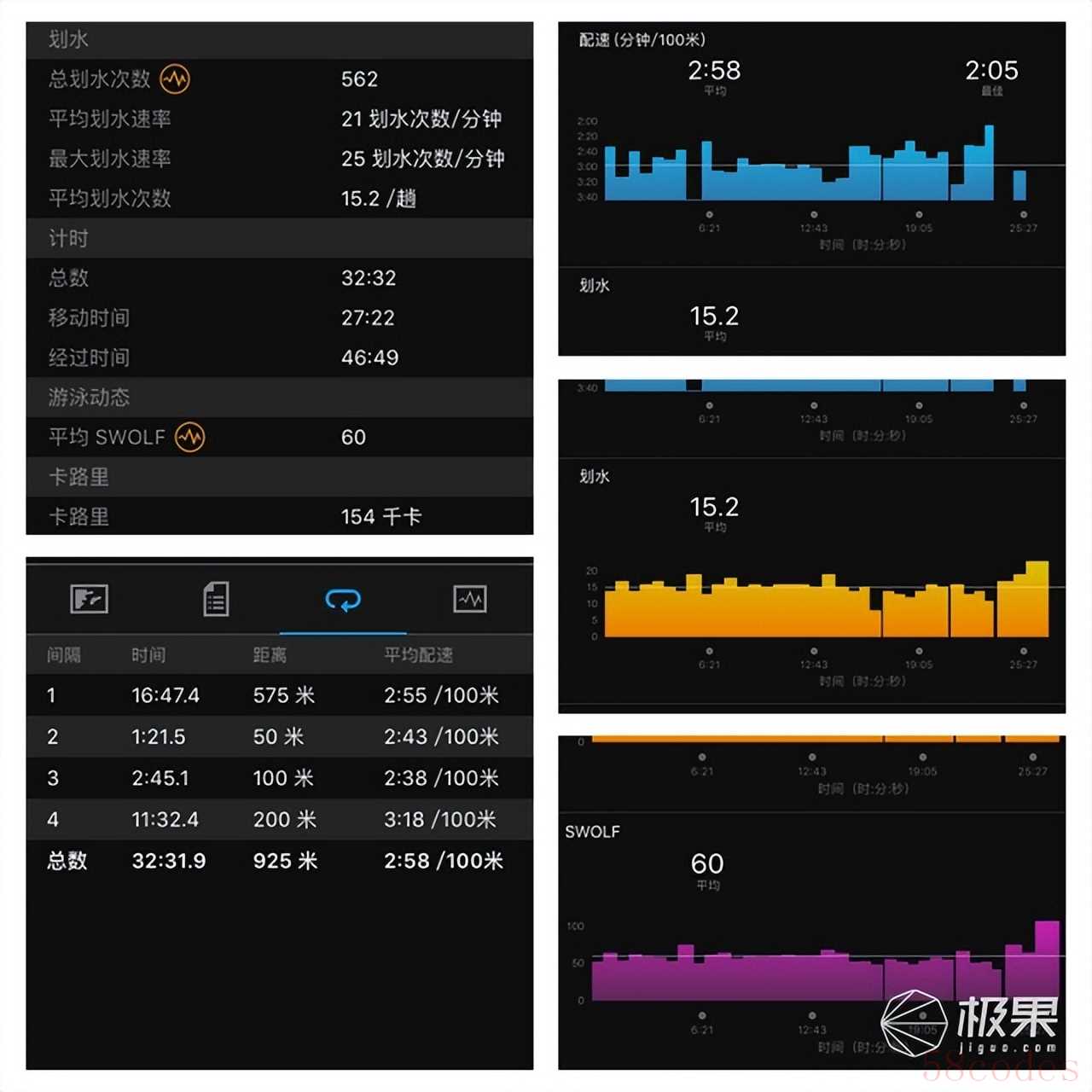 Connect也有更加详细的数据,看到数据的中的不同了没?对,在游泳时,我并没有记录下心率数据,这个问题很简单,因为与皮肤接触时缝隙,其中就有水进入,记录的数据并不是很准确,其他数据却可以很精准的记录,就这么专业的玩。