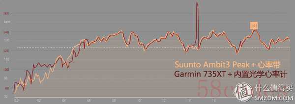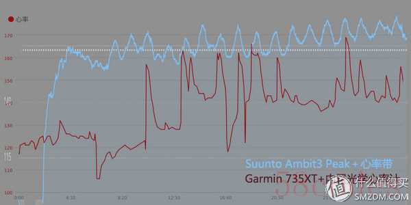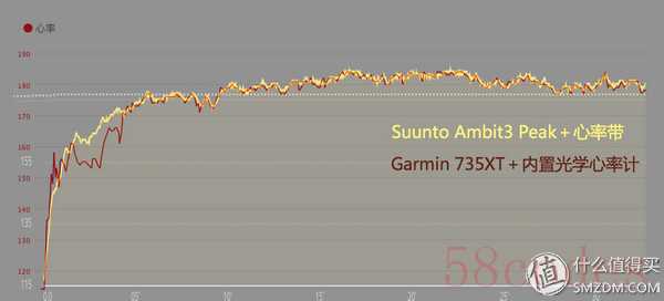 在多次跑步测试中发现735的光学心率准确度表现出色,偶尔在个别情况下会出现些许偏差,比如上图就是这种情况。与735XT光学心率进行对比的是Ambit3 Peak的标配胸式心率带,可以看到在起步的心率迅速爬升阶段735的曲线误差较大,但是在5分钟后,它与传统心率带测量出的曲线的吻合度极高,尤其是在小尖峰位置上都重叠的相当好。开头的误差不是每次都这样,而是偶尔出现,有可能是和未热身有关。比如下面这张图也是这样。
