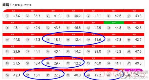 在测试自动记圈的时候发现了上图的问题,蓝色圈出来的部分本应该是一趟25米的数据,但是被拆成了2或3段,也就是说735将一趟计成了好几趟,这应该是和游泳过程中变换泳姿有关。为了验证这一猜想,又进行了下面的测试。