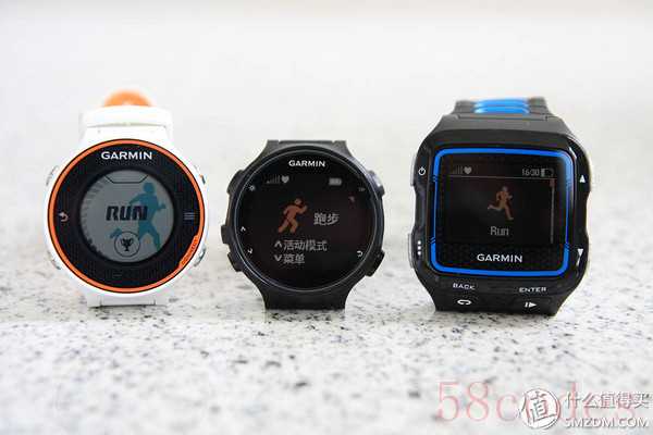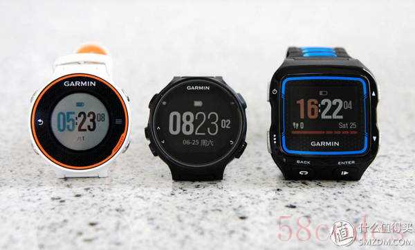 左中右分别是620,、735XT和920XT,620采用的是触摸+物理按键的操作方式,共6个按键;920只靠物理按键,一样是6个按键;735则是有着类似620的圆形屏幕,但采用了920的纯物理按键的操作方式,共5个按键。而且可以明显看到735的屏占比比620高很多。
