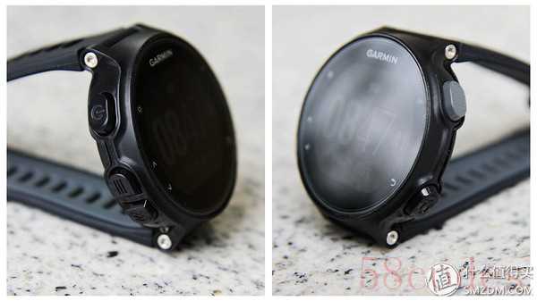 再换个角度看厚度。735在表盘左侧集成了3个按键,其中上下翻页键一起放到了左下方,相比620和920这种一侧只有两颗按键的设计在盲按定位速度上会略慢一些,好在735的翻页键面积不算小,所以误操作的几率也不大。