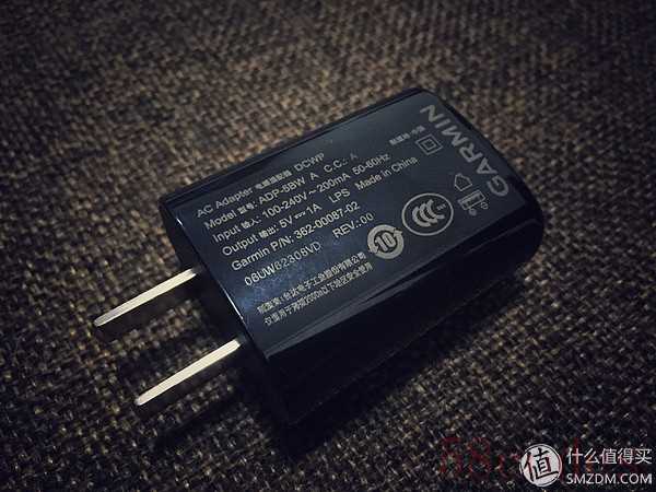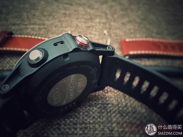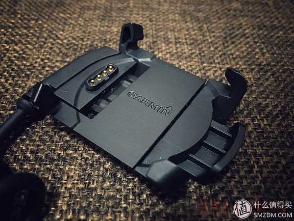 充电的设备不是侧面式的夹子,而是带着锁扣的充电座。把食指和拇指放在Garmin标志的左右一捏手表就可以向下放入,然后松开手四个角的卡扣就把手表牢牢的扣在充电座上。