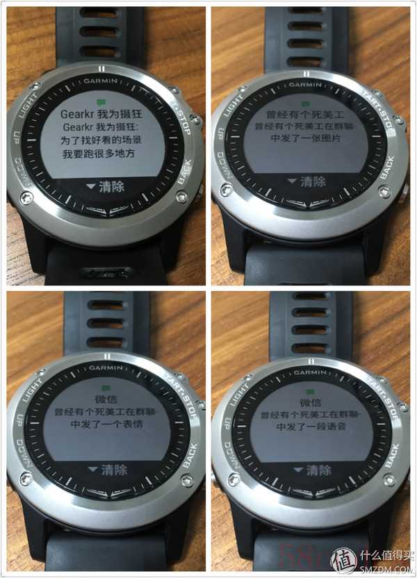 拿最常使用的微信来说,打开“通知显示消息详情”就会和左上角的图片一样显示出推送的内容,如果内容不完整,只需要按一下“START·STOP”就可以通过翻页查看完整内容。非文字消息则会和图中一样显示出消息的类型,可惜不能查看和收听,所有的推送消息都仅仅只能查看,想要回复必须使用手机。即便如此这功能依旧非常有用,因为日常推送中很多消息知晓便可并不是每一条都需要回复。在我们忙碌时它又能让我们选择性的去回复重要消息不必频繁的解锁手机,一定程度上能让我们保持工作效率。
