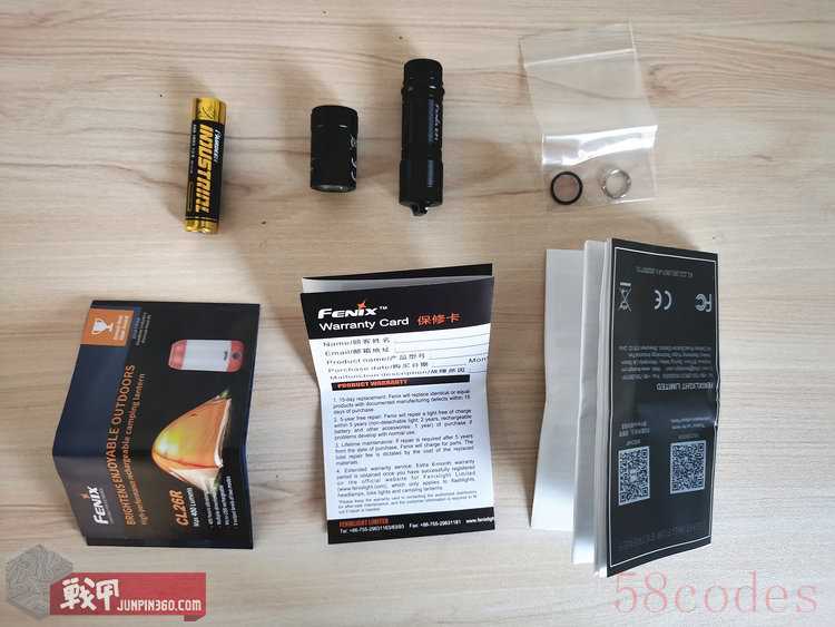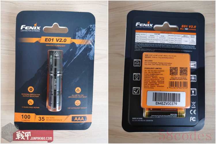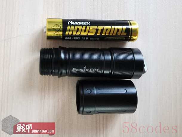 包装内含有: E01 V2.0本体,双鹿牌AAA电池一节,钥匙环一个,备用密封圈一个,说明书一张,保修卡一张,Fenix产品手册一张。