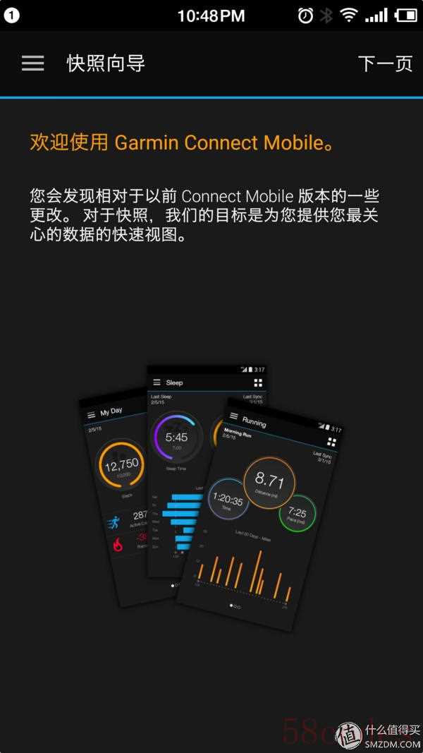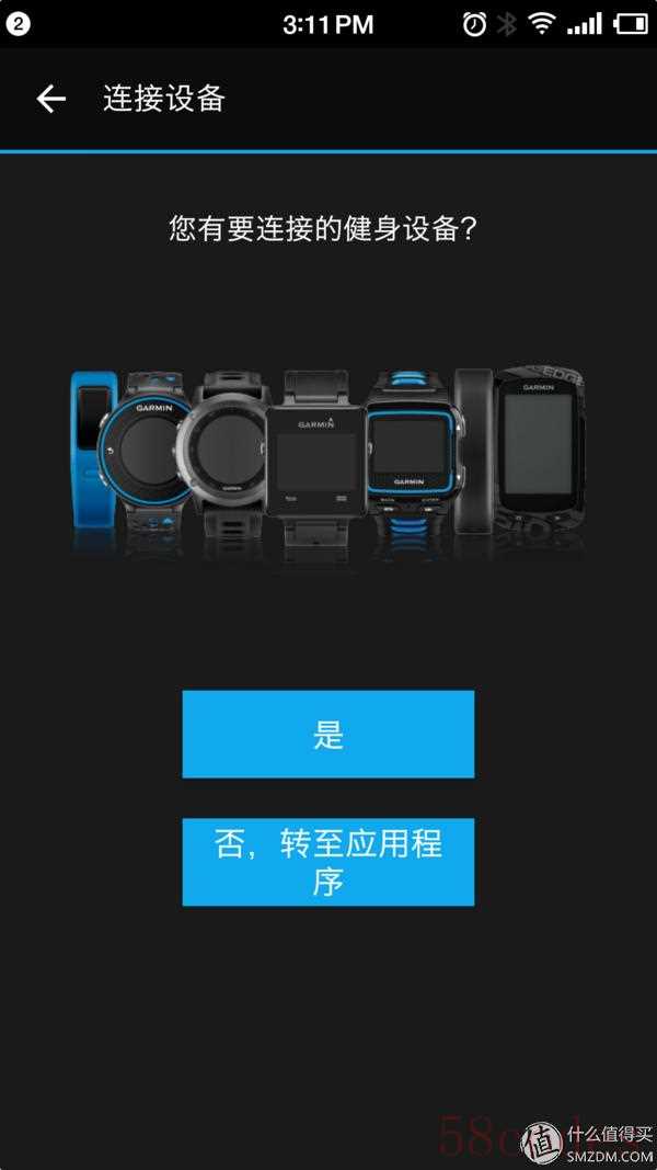 开机设置语言之后就会自动开始和手机进行连接、同步。可以直接扫描包装外侧的二维码进行APP的下载,APP支持安卓和IOS(WP不哭!)苹果4S以上和安卓4.3以上,外加蓝牙4.0的手机都可以实现自动上传、来电提醒和只能通知等功能。APP名字叫:Garmin Connect Mobile,也可以自己去官网、APPSTORE或搜索引擎下载。