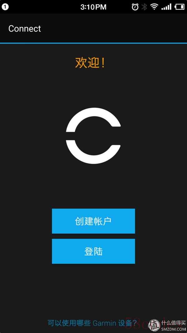 打开APP进入主页,提示创建账户或登录,如果之前有用过Garmin的设备,拥有账号的话是可以直接登录的。