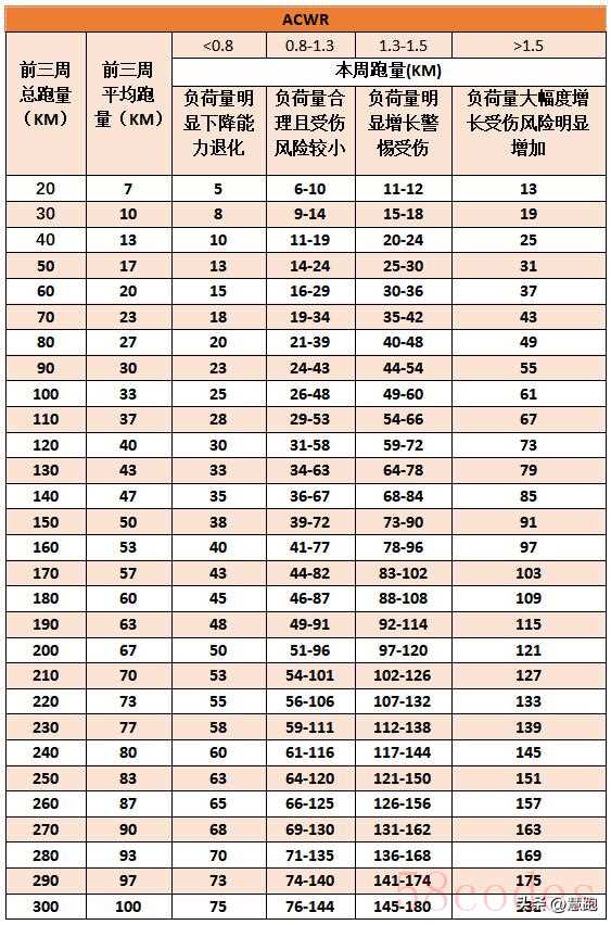 根据该公式计算了根据ACWR公式和过去三周跑量来计算跑者本周合理跑量的计算公式,跑者可以根据下表评估自己多大跑量是安全的,并且不会受伤。