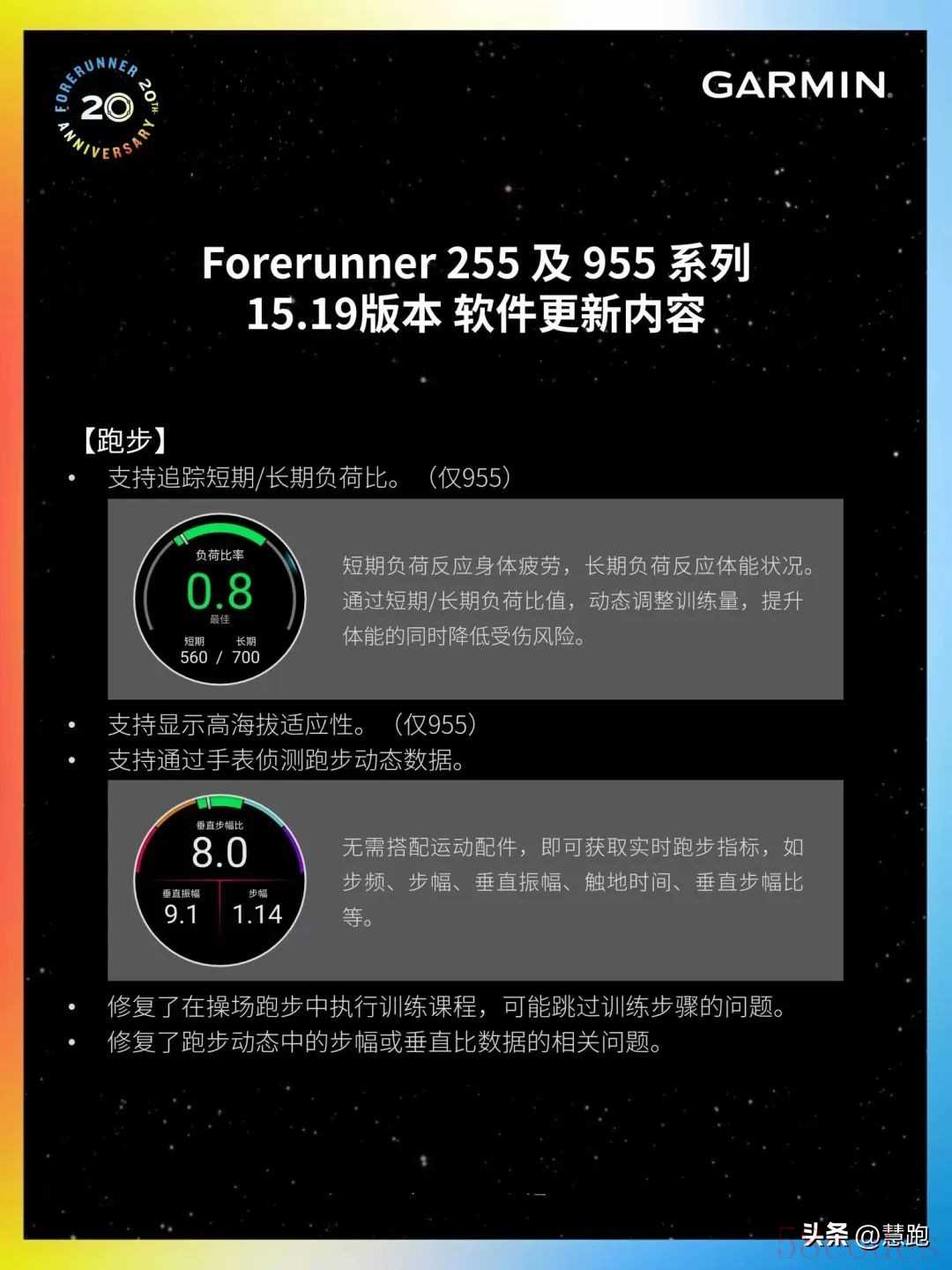 近日,佳明老款Forerunner255/955软件完成更新,其最大改变是将最新款265/965才具备的训练负荷评价以及跑姿评价功能下放至255/955;
