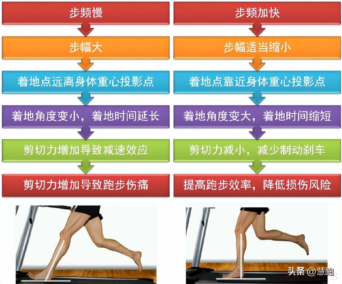 下图比较了慢步频和快步频的差异。相对快的步频减少了腾空高度,让触地点更加靠近重心,这样可以有效减少地面冲击力和制动剪切力,从而保护人体。