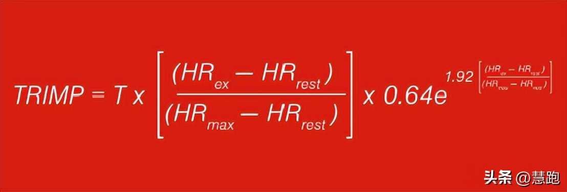 下图显示了训练冲量的基本计算公式,T代表训练时间用分钟表示,HRex代表训练时的平均心率,HRrest代表静息心率,HRmax代表最大心率,e为自然常数2.7182;