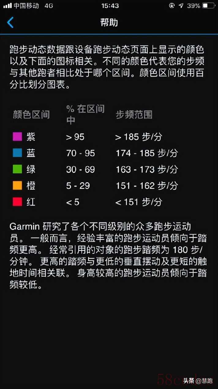 佳明用不同颜色加以区分,目的是帮助大家更好地理解自己所处的水平,步频最快的用紫色表示,步频较快的用蓝色表示,绿色表示步频处于中间水平,也即约有一半的跑者与你的步频相当,橙色代表步频较慢,红色则代表很慢,在佳明手表中,红色和橙色属于警戒色,代表你需要加快步频。