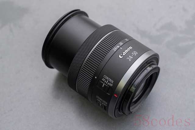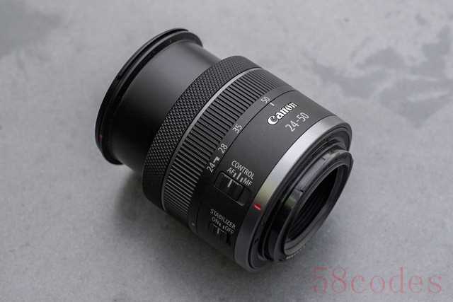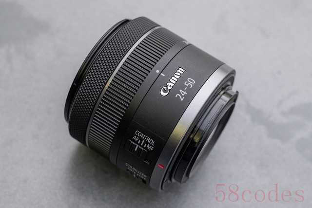 由于采用了佳能RF镜头标准设计,在佳能RF24-50mm F4.5-6.3 IS STM镜头从前组到镜头尾部一次排列着对焦环/控制环、变焦环以及两个镜头功能拨杆。