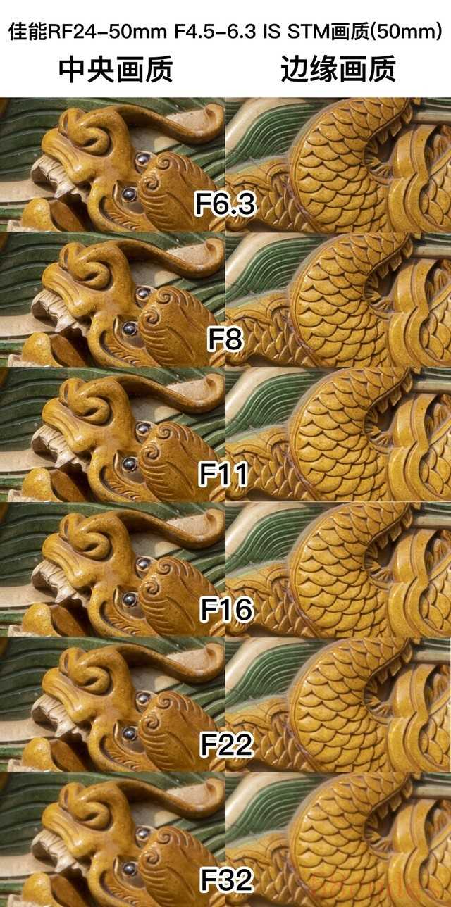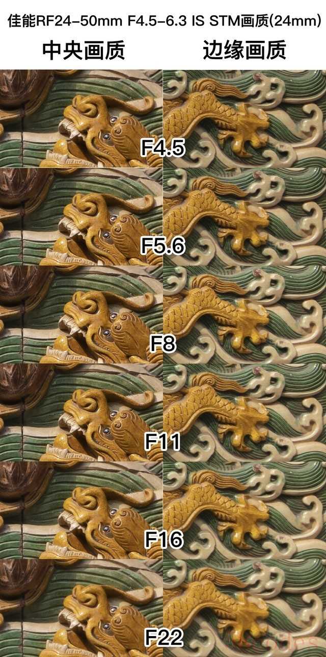 佳能RF24-50mm F4.5-6.3 IS STM在24mm端启时光圈为f/4.5,最小光圈为f/22。通过实际拍摄可以看出,镜头在全开光圈下,画面中心和边缘的锐度表现都不错,光圈缩小之后,镜头的中心和边缘画质都达到了最佳画质表现。当镜头光圈缩小到f/22时,镜头中心和边缘画质锐度虽有所下降,但整体表现不错,日常拍摄完全可以放心使用。