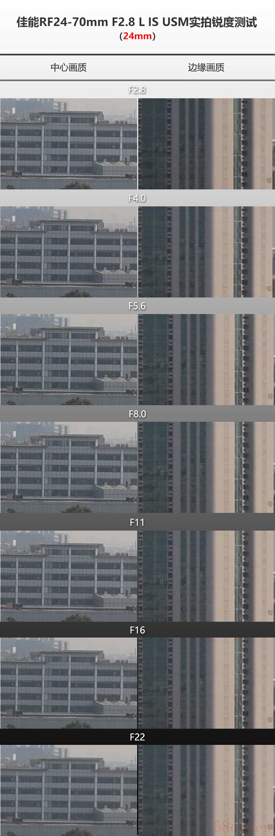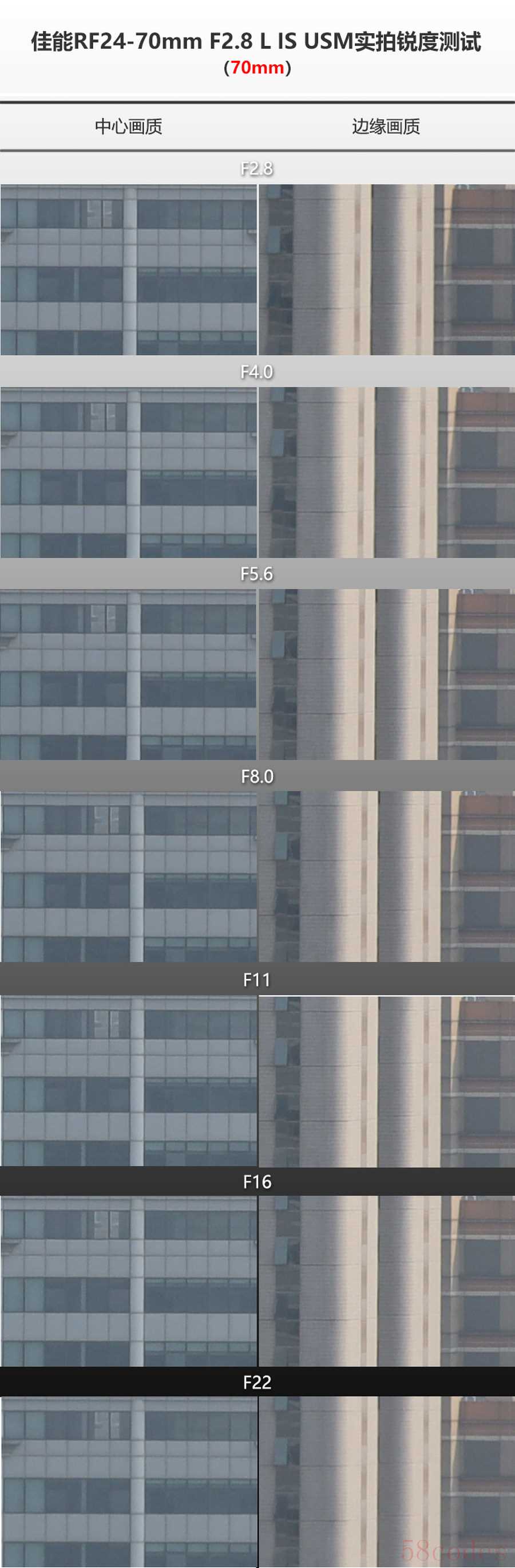 在70mm焦段,RF24-70mm F2.8 L IS USM在F2.8光圈全开时,表现与广角端时一样锐利,但当光圈收至F5.6时,中心和边缘画质都展现出该镜头的实力,F8-F11时则达到最高分辨率。而即便是F16-22这样的小光圈下也依然没有因为镜头衍射现象对画质造成太大损失。一方面能看得出这枚RF24-70mm F2.8 L IS USM确实有着超高的光学素质,另一方面RF卡口大口径短后对焦距离的优势也十分明显。