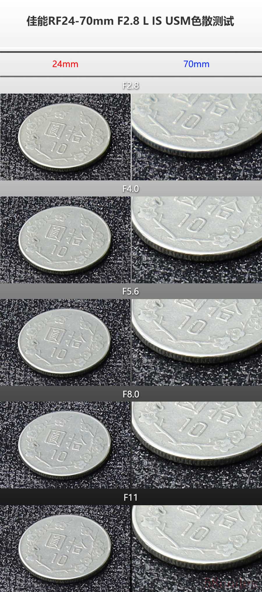 从上图拍摄的样片来看,24mm广角端F2.8光圈全开时,镜头四周有出现失光现象,但并不算非常明显,在缩小一档光圈后,基本上可消除暗角;而在70mm端时,和24mm端情况类似,暗角情况同样不算严重,收至F4光圈后无明显暗角。