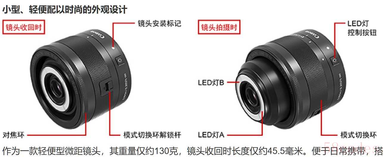 佳能EFM28mm微距镜头的回收式结构示意图,而15-45mm回收后的长度比它还短。