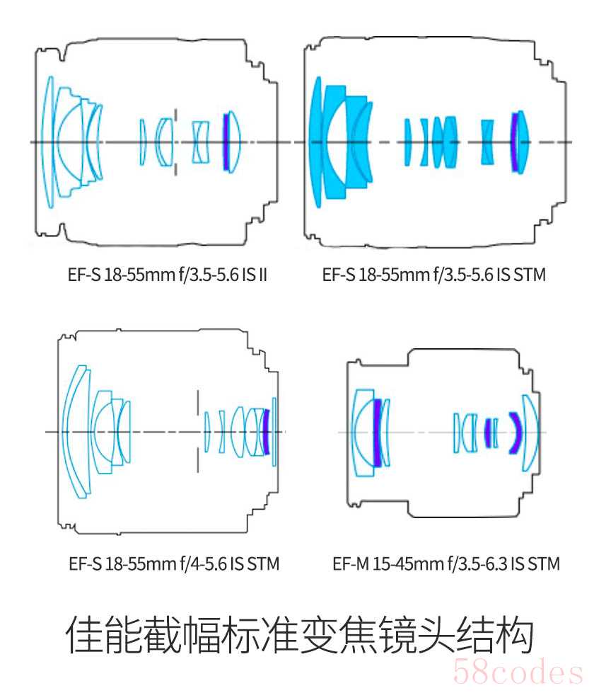 佳能为截幅相机配套的标准变焦镜头,先后推出了11枚。分别是EFS卡口不带防抖五枚,带防抖两枚,再改为STM(一种对焦驱动方式,有利于视频拍摄)又出了两枚;EFM卡口,也已经推出了两枚,最新的一枚甚至为了缩小体积修改了变焦范围,并把结构改成了回收式,收纳的体积大大减小。