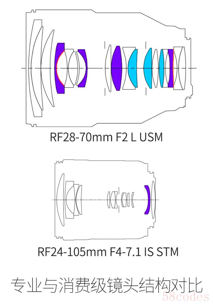 从上图两枚佳能RF卡口镜头结构对比,可以看出专业级镜头和消费级镜头的明显差异。专业级镜头光路更通畅、镜片更多、特殊镜片(有颜色的)也更多,从而获得更大光圈、更小色散、更轻微变形,当然还有更大的体积。
