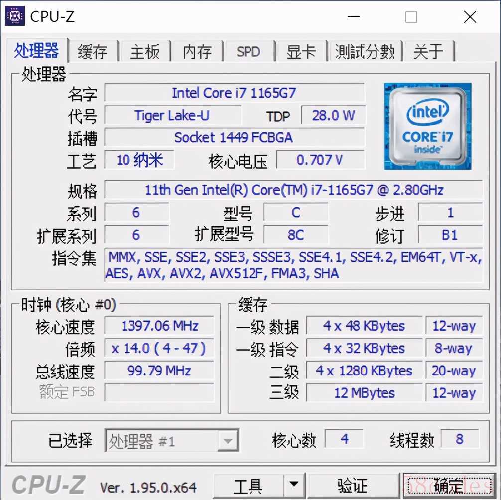 处理器:英特尔酷睿i7-1165G7(4核8线程,2.8GHz~4.7GHz)