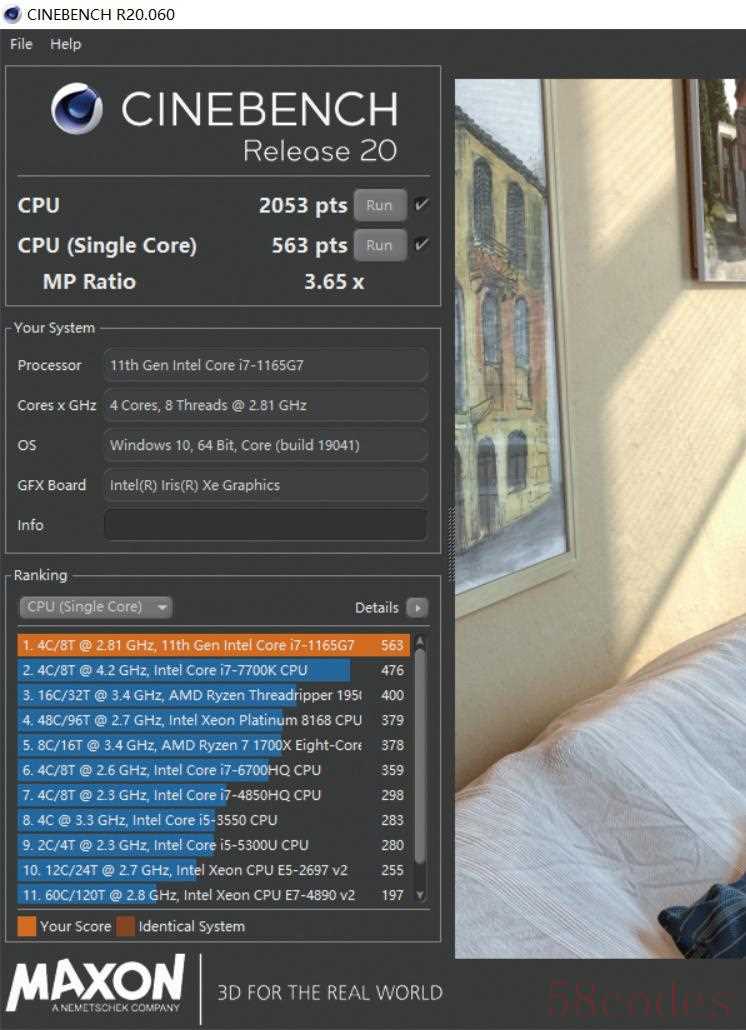 ▲CINEBENCH R20单线程563pts,多线程2053pts。