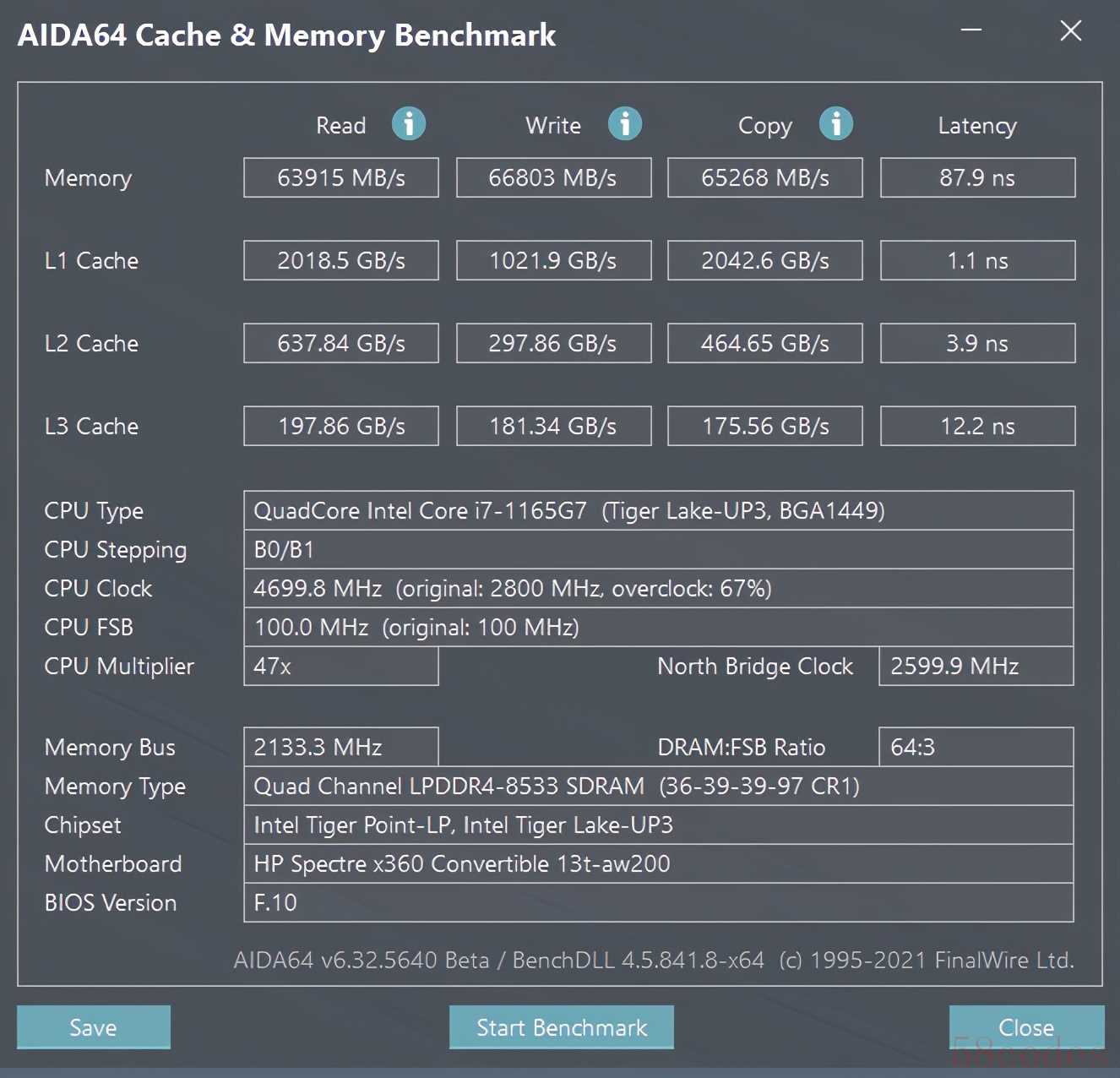 ▲在AIDA64软件的缓存与内存测试中,这台机器的内存读取速度和写入速度均保持在63915MB/s以上。