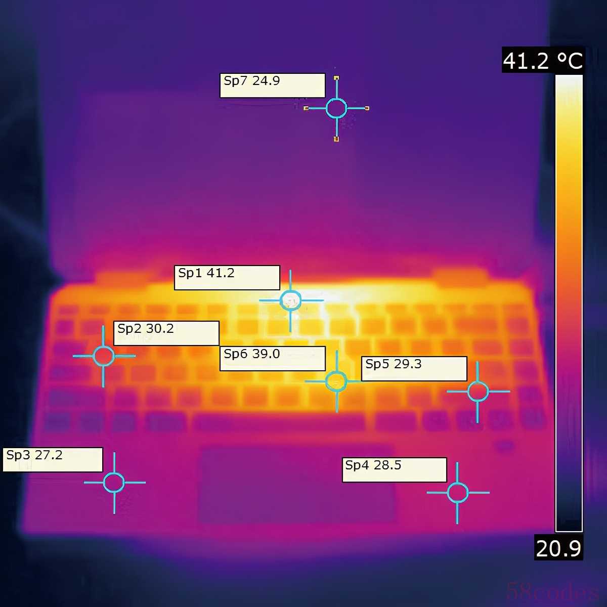散热方面,我们在性能模式、连接电源的情况下通过AIDA64软件对这台机器进行烤机测试。在22.6℃室温下烤机30分钟后,我们通过FLIR红外热像仪观察到这台机器正面外表最高温度为41.2℃,位于C面中部靠近转轴的位置。从热成像图可以看到,烤机后的高温主要集中在键盘中央顶部(大约39~41℃),键盘大部分区域的温度保持在30℃左右,摸上去并不烫手,而掌托位置的温度仅28℃左右,不会给用户带来使用上的困扰。
