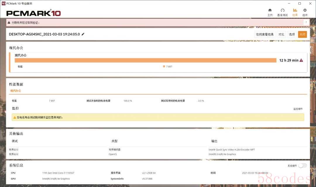 ▲这台机器在PCMark10的“现代办公”场景下取得12小时29分钟的续航成绩。
