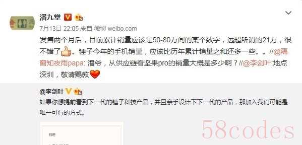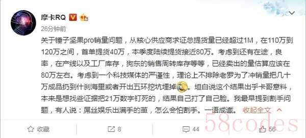 另外,数码博主@摩卡RQ 也称,从核心供应商处证实,坚果Pro的提货量已经超过100万,在110万至120万之间,考虑到种种原因,已经卖出的量应该在80万左右。