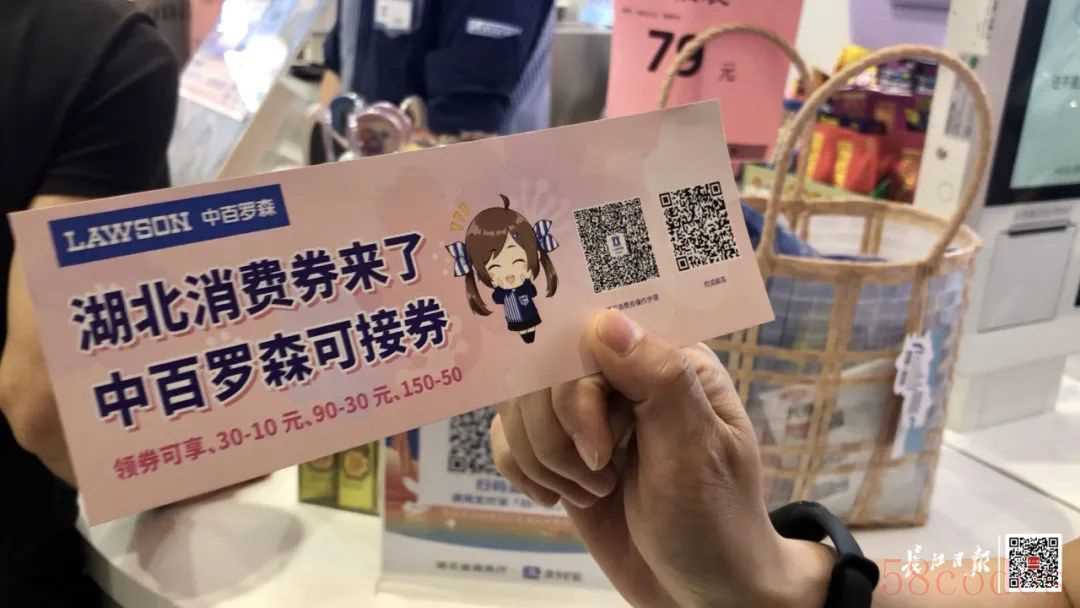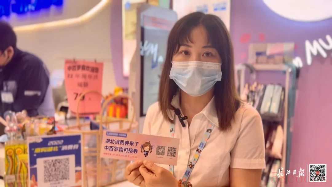 武汉中百罗森便利店店员向记者展示“惠购湖北”消费券。记者张珺 摄