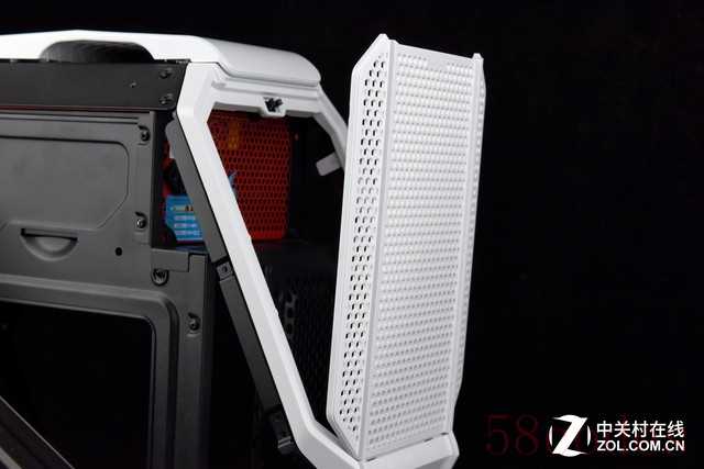 产品背部采用大面积的的散热防尘网设计,并且设有微动开关,易于玩家拆卸。散热网下方设有圆形电源线材理线口。后面装机有介绍。