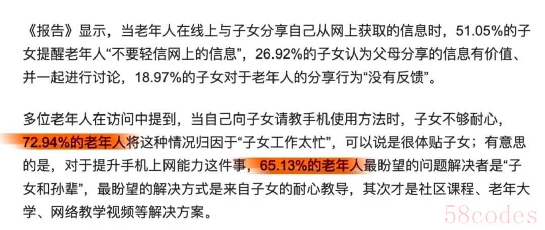 毕竟前面的报告还指出,65.13% 的老年人最盼望子女、孙辈教用手机,同时 72.94% 的老年人也能理解没时间教是因为 “子女工作太忙”。