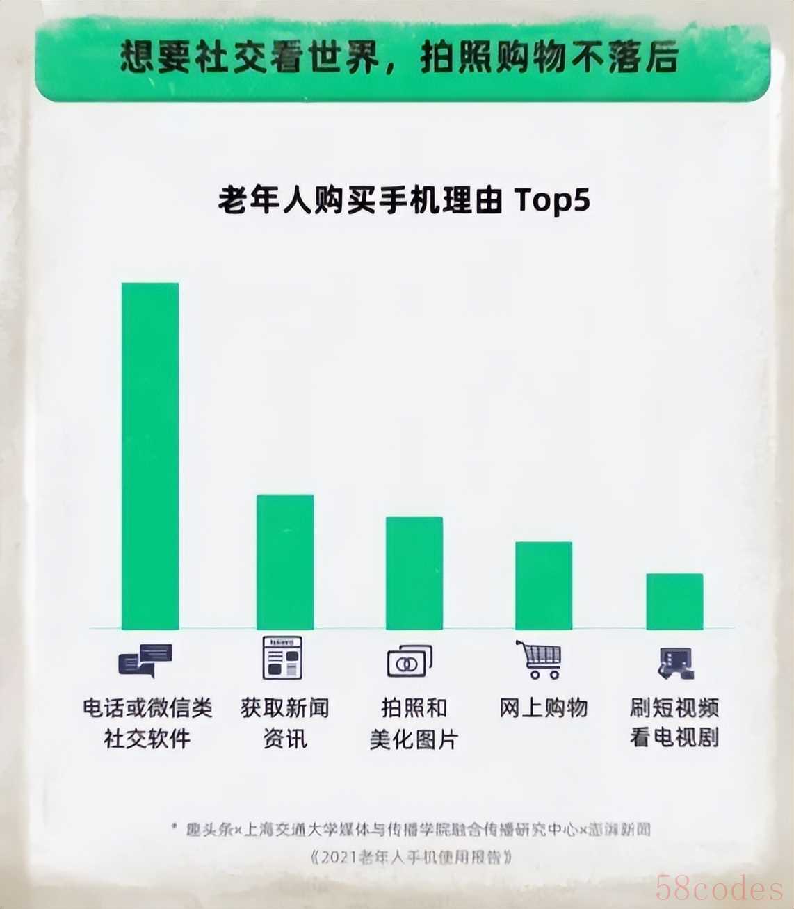 而根据《2021 老年人手机使用报告》,在买智能机的老年群体中,他们购买的理由 TOP5 分别是社交沟通、获取新闻资讯、拍照、网上购物、刷短视频看电视剧。
