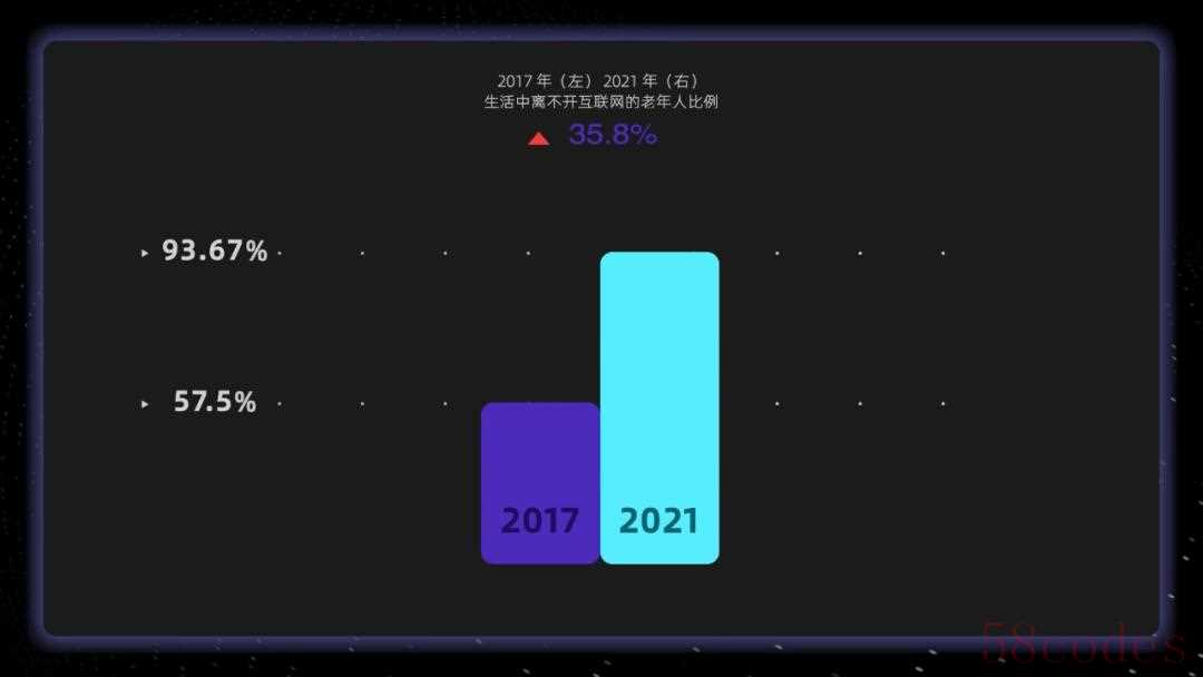 根据《后疫情时代的互联网适老化研究》报告,2017 年对比 2021 年,生活中离不开互联网的老年人比例已经从 57.50% 提高至 93.67%。