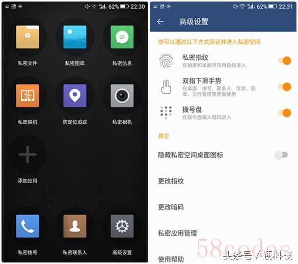 相较于之前,私密空间2.0一方面是安全保护范围更大了,它作用于联系人、短信、通话记录、图片、文件、APP、视频等;而另一方面则是功能的打开方式更丰富了:支持私密指纹、 双指下滑手势、拨号盘输入暗码三种方式进入。更加给力的是,用户还可以选择对“私密空间”的桌面图标也进行隐藏,这样一来别人压根就找不到这个功能的入口。