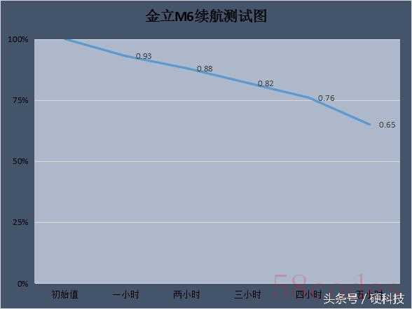 从图表中我们可以看出,金立M6满电经过5小时连续视频播放之后,剩余电量还有65%,这样的成绩甚至可以说是有点变态了。