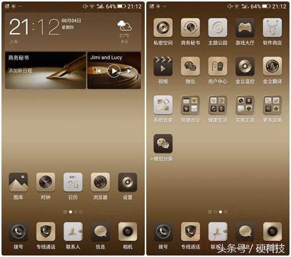 首先,金立M6在主题上凸显了浓重的商务气息,所有系统图标和预装APP图标的风格都是很统一的金色基础色调,视觉上先给人一种商务范的印象。
