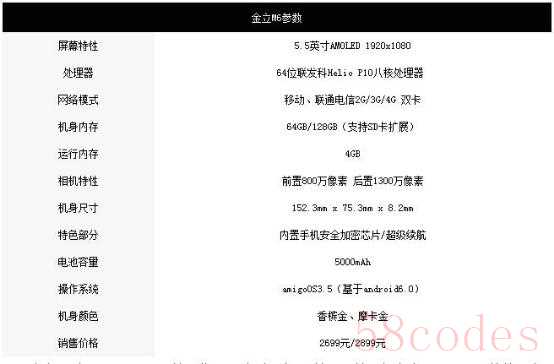 ●金立M6参数信息表