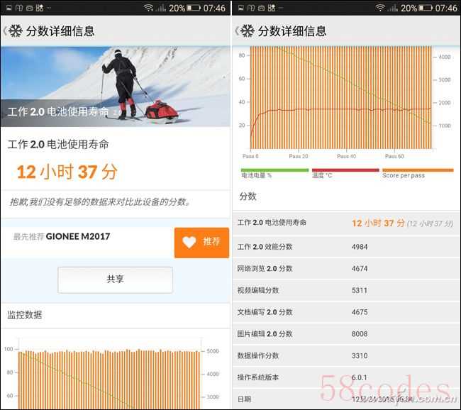 在PCMark工作2.0电池使用寿命测试中,金立M2017取得了12小时37分钟的成绩,这个表现应该算是Android手机领域之最了。PCMark续航测试基本可以代表咱们日常看在线视频、浏览网页和看小说的压力负载。换句话说,如果你一直拿着M2017不间断看视频,13小时以后还能剩下至少20%的电量!