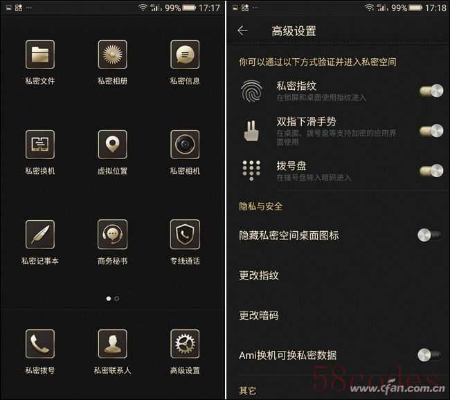 在M2017的安全功能中,私密空间应该是最实用的。在这里,我们可以将不希望被其他人看到的文件、照片、短信添加其中。使用私密空间中集成的私密相机、私密记事本和私密拨号、联系人产生的内容也会被自动加密,使用系统默认的相册、记事本和通话记录是查询不到的。而私密空间这个APP和图标也能彻底隐藏,只有通过指纹或在拨号界面输入指定密码才能启动,安全性十足。