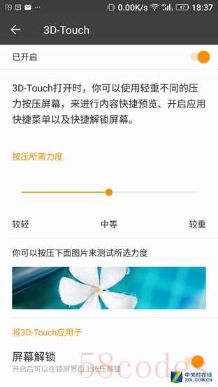 金立S8的压力感应功能开关位于其“系统设置-高级设置”栏目中,系统默认开启状态,不过你并不用担心它对续航的影响。另外,在打开该功能后还可以借助于测试图片来调整按压所需力度,金立S8支持较轻、中等和较重三种模式可选。