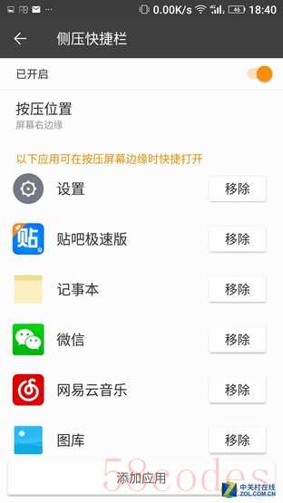 除了上面提到的功能外,金立S8还在系统支持下为用户带来了可自定义的侧压快捷栏功能,该功能可以说是金立S8区别其它压力感应屏幕手机的卖点之一。使用方法是,当我们在按压手机侧边屏幕时,会弹出快捷栏,用户可以自定义该栏目中的应用,最多可选6个常用应用,这么一来,像在我们日常突发需要切换应用时,就不用费劲力气切回桌面然后翻页寻找,而可以直接快速的打开某项应用。