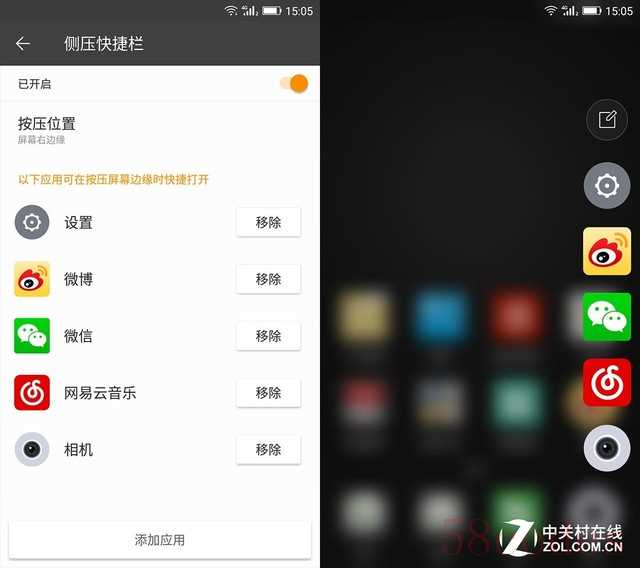 此外,金立S8不单单满足于App按压弹出快捷菜单的功能,还增加了对侧边按压快捷栏的支持,通过设置可以添加自带或者第三方应用,然后在屏幕的右侧按压弹出侧边栏,当然,如果你更喜欢左手操作的话也可以改到左侧。这一功能的加入大大扩展了压力感应的应用范围,同时也可以让用户以最快的速度打开这些常用应用。