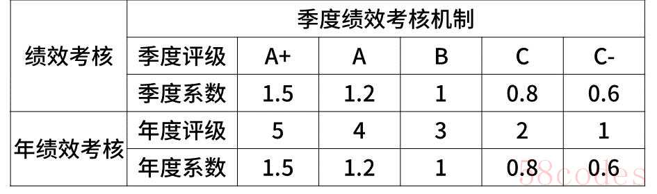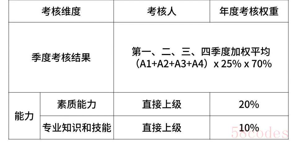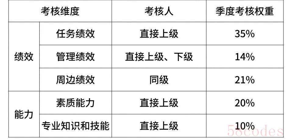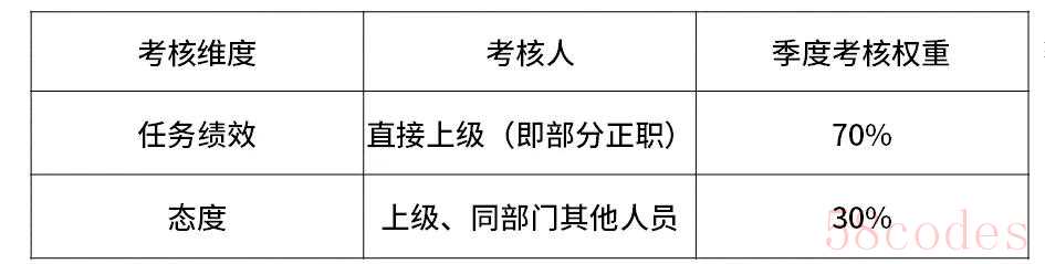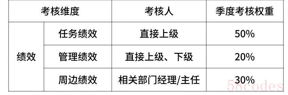 1、季度考核:中层和一般员工都要通过季度考核,根据不同的对象,考核维度与权重也不同。