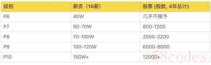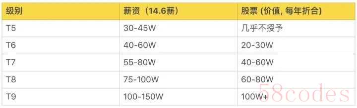 不同序列间月薪base差异较大,技术base整体偏高。比如2-1月薪会在20k+,2-2的package会在60w-100w左右(算上期权,大概会占30%左右)。T2-2 级别的薪资约40k,500股票/每年。