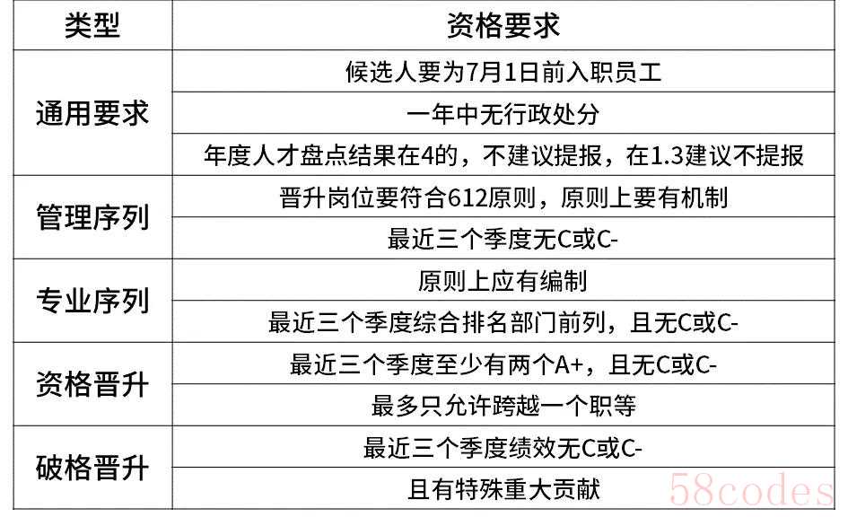 - 自己提名:当你自己觉得已经具备下一level的素质,可以自己提名,提名后进入考察期,主管设定考察期目标,考察通过顺利晋升,考察不通过维持原层级不变;